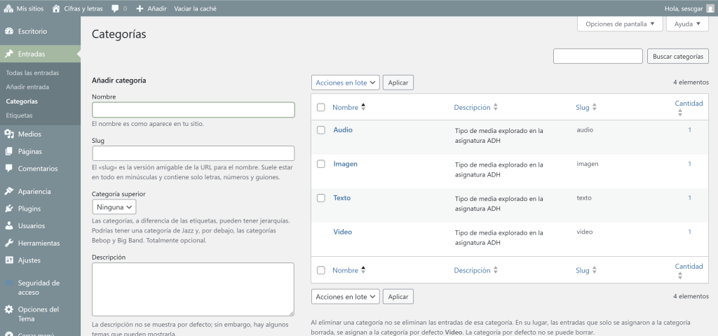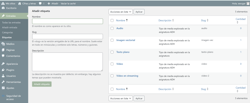 1. Descripción de capturas Video por sescgar - 19 de diciembre de 202519 de diciembre de 20250 Esta es la primera de las 3 nuevas entradas. En esta mostraré con capturas la creación de categorías y etiquetas. Tantas categorías como media (tipos de medios) vamos a explorar en la asignatura: texto, audio imagen y vídeo: Un par de etiquetas para cada categoría: texto plano, texto estructurado, audio en forma de ondas y audio MIDI, imagen en mapa de bits e imagen vectorial, vídeo y vídeo en streaming: